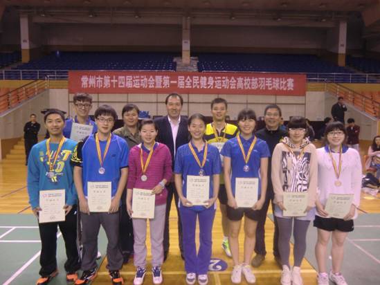 本届运动会的高校部羽毛球比赛由常州市人民政府主办,常州市体育局、市大学生体育协会和我校承办。比赛项目为男女混合团体,赛制按单循环赛三场二胜制。本次比赛共有9支代表队参赛,男女运动员近90人。我校羽毛球队由体育教学部副主任张君其老师担任领队,教练由经验丰富的奚国庆老师担任,校羽毛球协会丁达、杨晨等十位同学为队员。在比赛中,我校代表队不畏强敌,奋勇拼搏,在比赛中发挥出了较高的技战术水平和良好的心理素质,获得团体第二名的好成绩。另外,我校代表队还获得“体育道德风尚奖运动队”,丁达和杨晨同学获得“体育道德风尚奖运动员”,奚国庆老师获得“优秀教练员”称号。