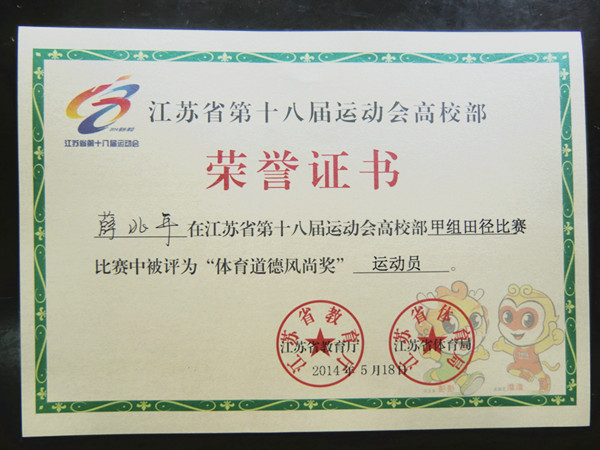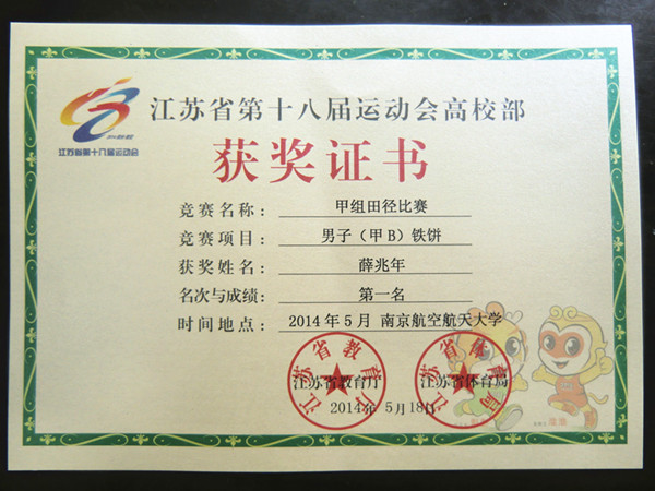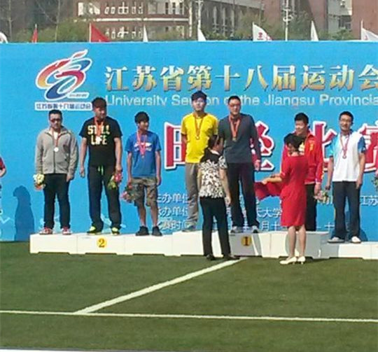 5月15日,江苏省第十八届运动会高校部田径比赛在南京航空航天大学举行,本次比赛共有全省47支本科高校代表队共计1038名运动员参赛。在这次代表江苏省大学生最高水平的体育赛事中,我校土建学院12土二薛兆年同学获男子铁饼冠军,实现了我校省级体育竞赛金牌零的突破,为学校争得荣誉。