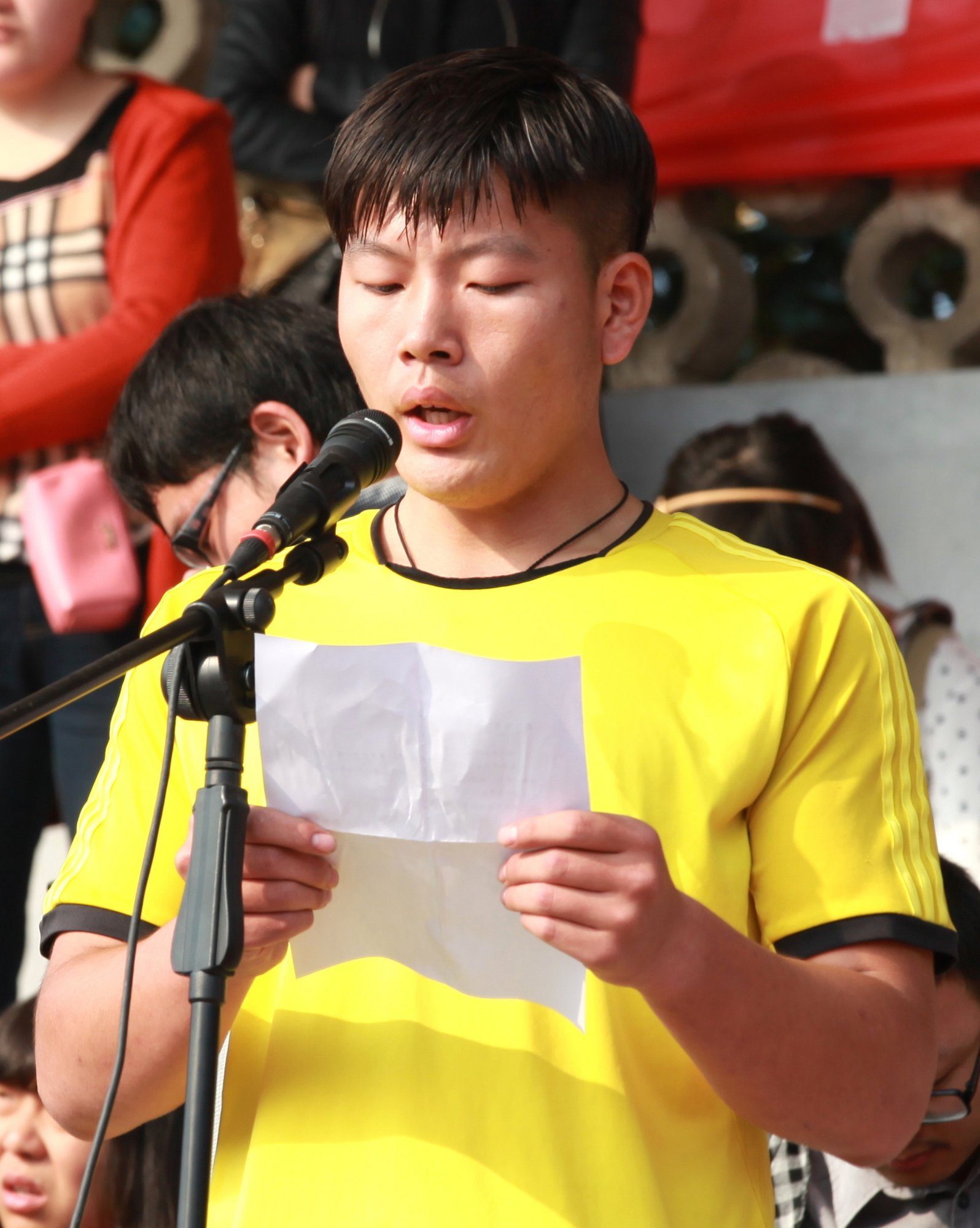 运动员代表薛兆年宣誓,做到尊重裁判、尊重对手、尊重观众,遵循“团结、奋进、文明、育人”的比赛宗旨,体现当代大学生风采;裁判员代表蒋益民宣誓,将遵守裁判规则,认真履行裁判员职责,本着“公平、公正“的原则,严格执法。教务处副处长李俊生宣布大会纪律。校长李文虎宣布第三十二届田径运动会开幕。