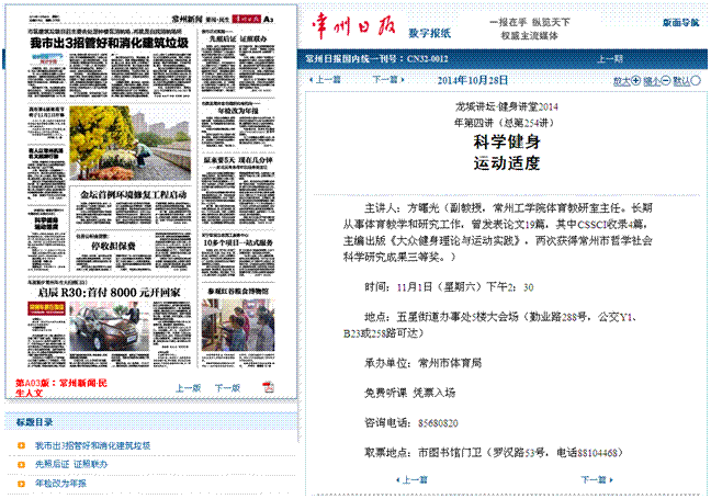 主讲人:方曙光(副教授,常州工学院体育教研室主任。长期从事体育教学和研究工作,曾发表论文19篇,其中CSSCI收录4篇,主编出版《大众健身理论与运动实践》,两次获得常州市哲学社会科学研究成果三等奖。)