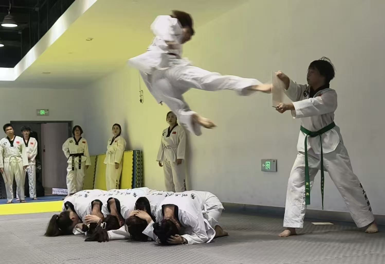 表演以“礼始礼终”开篇,成员身着统一道服,沉肩稳胯间出拳带风,动作兼具力度与韵律,尽显传统技法底蕴。随后的特技环节将气氛推向高潮:横空侧踢时身体如箭腾空,腿锋精准击靶;上步旋风踢以上步、转身、摆腿的流畅衔接展现暴发力;连续旋风踢更以多组360度旋转踢击,诠释“突破极限”的武道精神,击靶声与欢呼声此起彼伏。