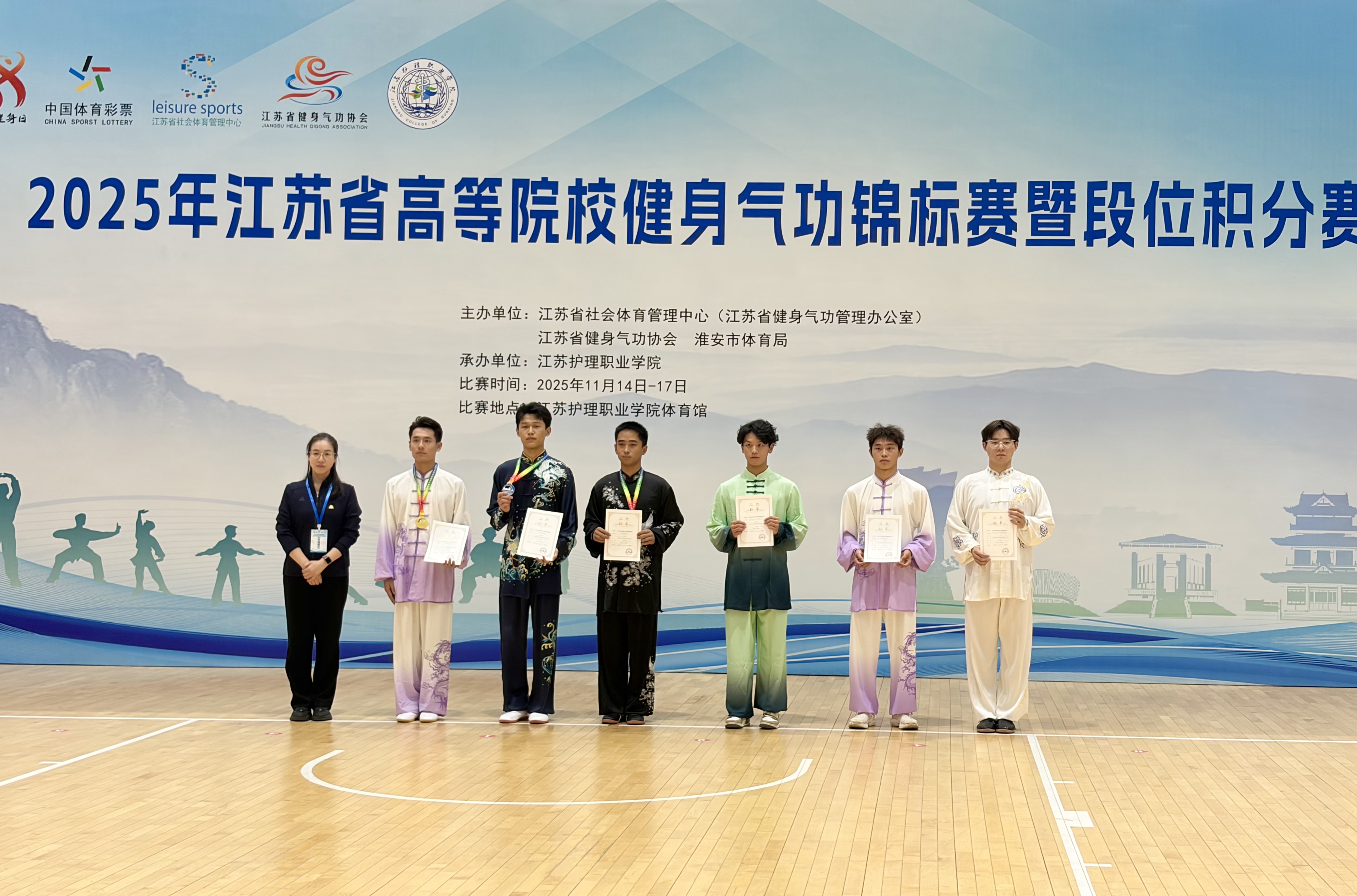 1117日,2025年江苏省高等院校健身气功锦标赛暨段位积分赛在江苏护理职业学院体育馆圆满落幕。本次比赛由江苏省社会体育管理中心、江苏省健身气功协会、淮安市体育局主办,江苏护理职业学院承办。全省57支高校代表队260名运动员参与11个项目38个小项的角逐。